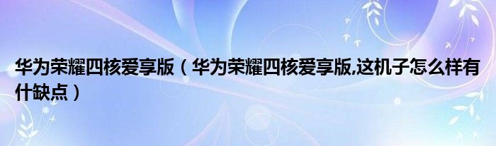 1,华为荣耀四核爱享版,这机子怎么样?有什缺点?:还不错,基本上四核手机能满足绝大多数程序和游戏,但是发热量和电池快始终是安卓手机弊端。这款机子还是值得入手的