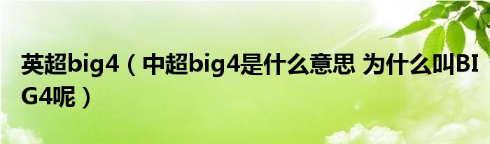 最佳答案关于英超big4,中超big4是什么意思 为什么叫BIG4呢这个很多人还不知道,今天菲菲来为大家解答以上的问题,现在让我们一起来看看吧!1、BIG4其实是对英超四强曼联、切尔西、利物浦、阿森纳的总称。2、因为这四强无论在英超还是欧冠在这几年的成绩都非常突出。3、所以叫他们BIG4...中超的BIG4是一些所...
