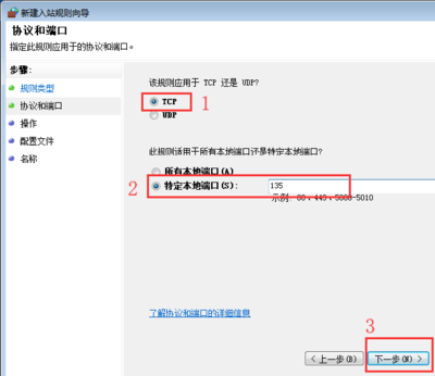 9、随后点击“IP筛选器 属性”的“协议”选项,将“选择协议类型”的选项设置为"TCP“,并将“到此端口”的数值填写为“135”;